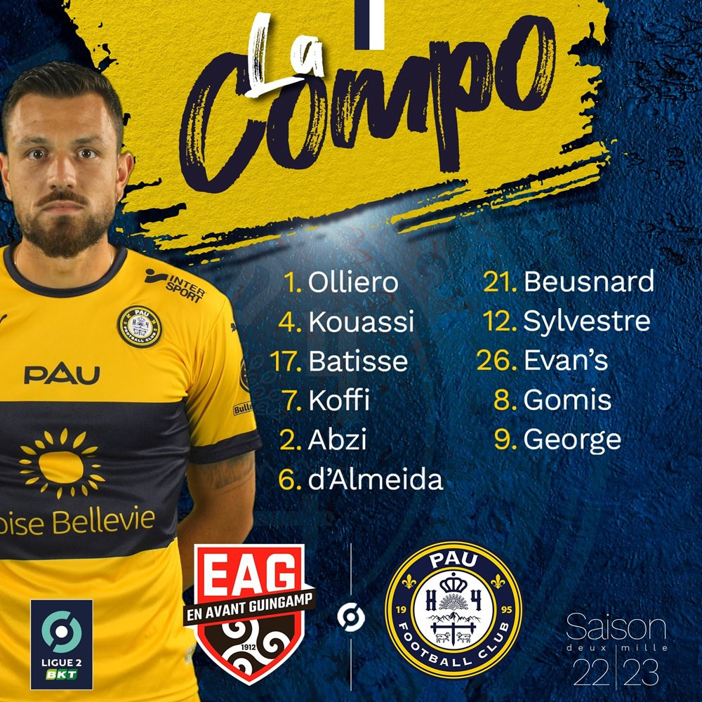 Pau FC (4-2-3-1): A. Olliero, A. Batisse, E. Koffi, D. Abzi, X. Kouassi, S. D’almeida, S. Beusnard, D. Gomis (Jean Ruiz 46'), Lambert Evans (Bassouamina 46'), E. Sylvestre (Quang Hải 60'), M. George (Walid Jarmouni 80')