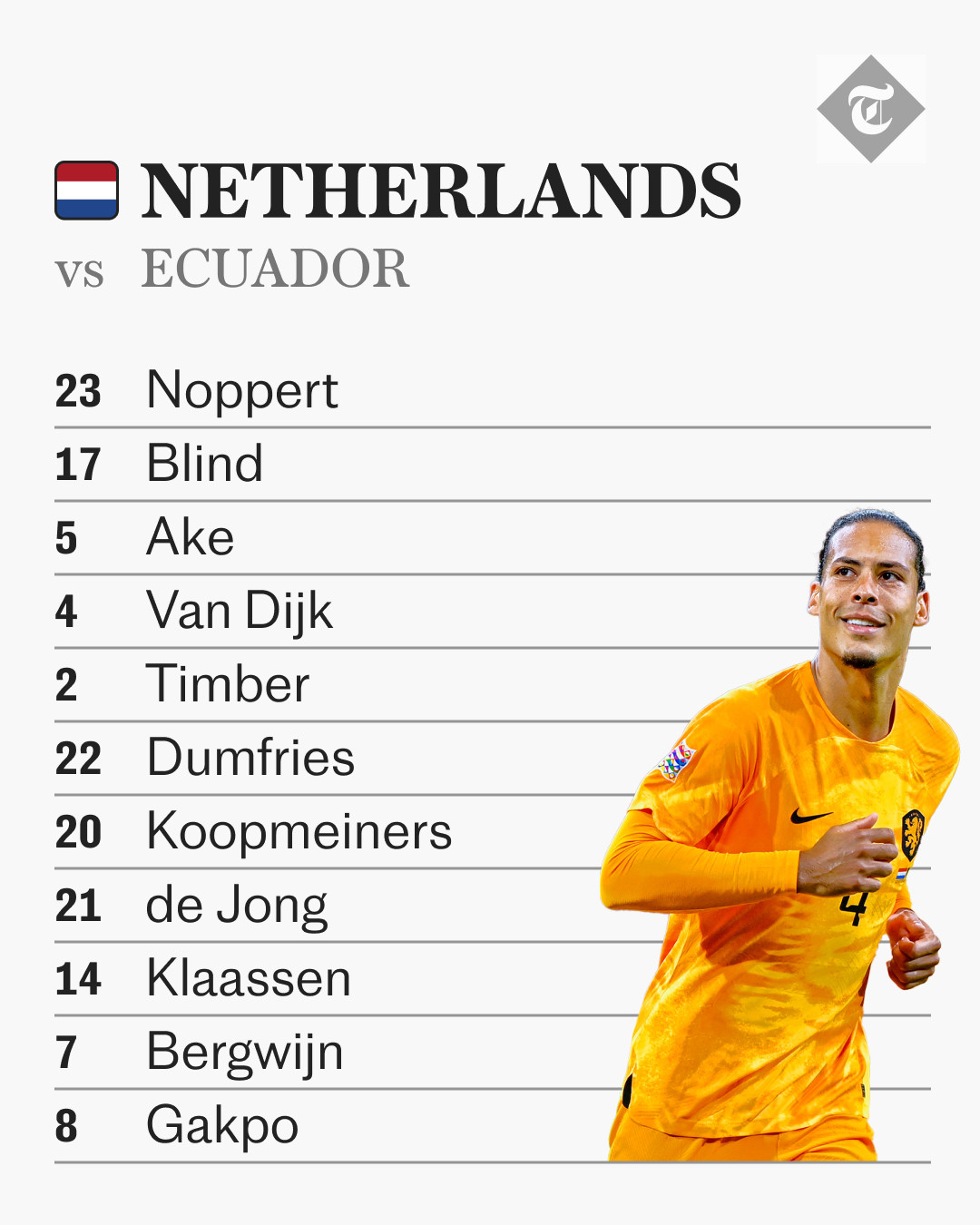 Hà Lan: Noppert; Timber, Van Dijk, Ake; Dumfries, de Jong, Koopmeiners (De Roon 79'), Klaasen (Berghuis 67'), Blind; Gakpo (Weghorst 79'); Bergwijn (Depay 46').