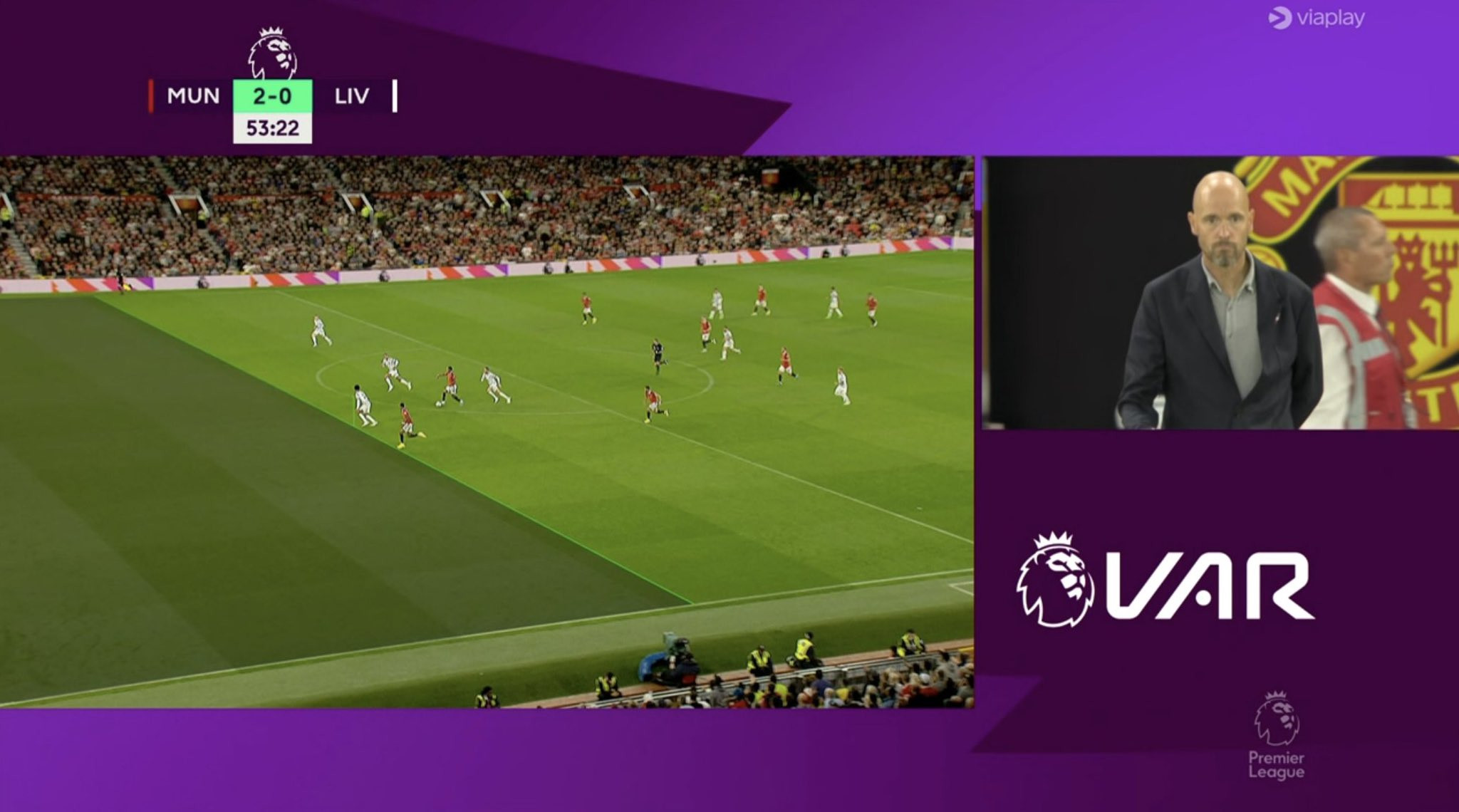 HLV Ten Hag có đến 3 sự thay đổi người, khi tung Ronaldo, Van de Beek và Wan-Bissaka vào sân. MU đang chơi phòng ngự phản công.