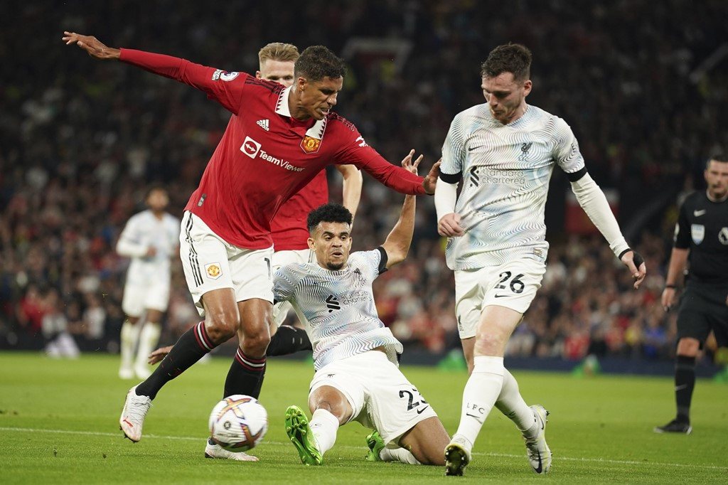 Diogo Dalot kiềm tỏa tốt Luis Diaz bên hành lang cánh phải. Hậu vệ người Bồ Đào Nha vừa bị phạt thẻ vàng cảnh cáo vì vào bóng quyết liệt.