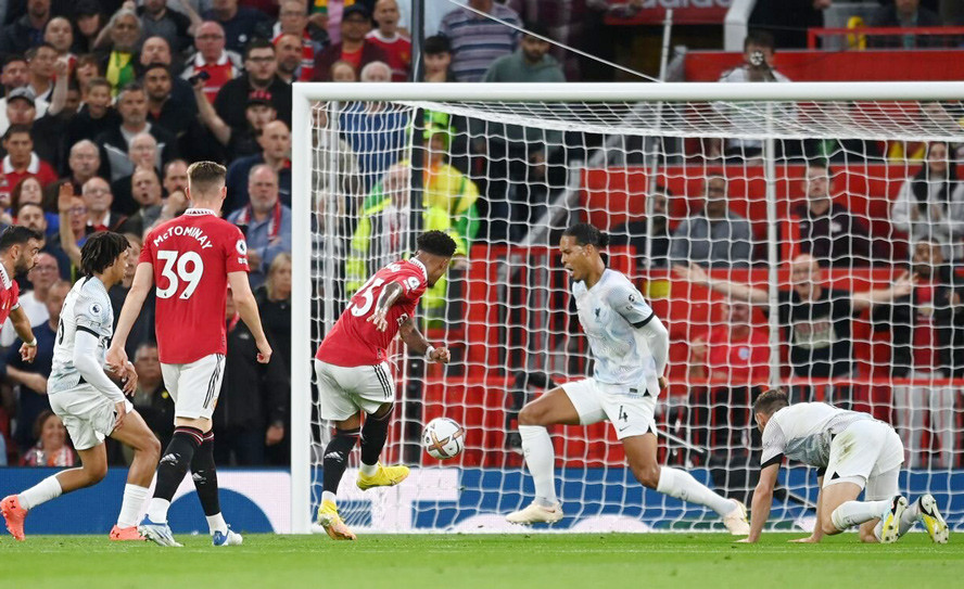 Rashford solo vượt qua 3 hậu vệ Liverpool nhưng cú đá cuối cùng lại đi hơi cao so với khung thành.