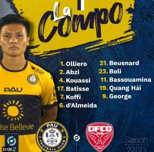 Video hình ảnh Quang Hải xuất hiện trong clip giới thiệu đội hình xuất phát của Pau FC