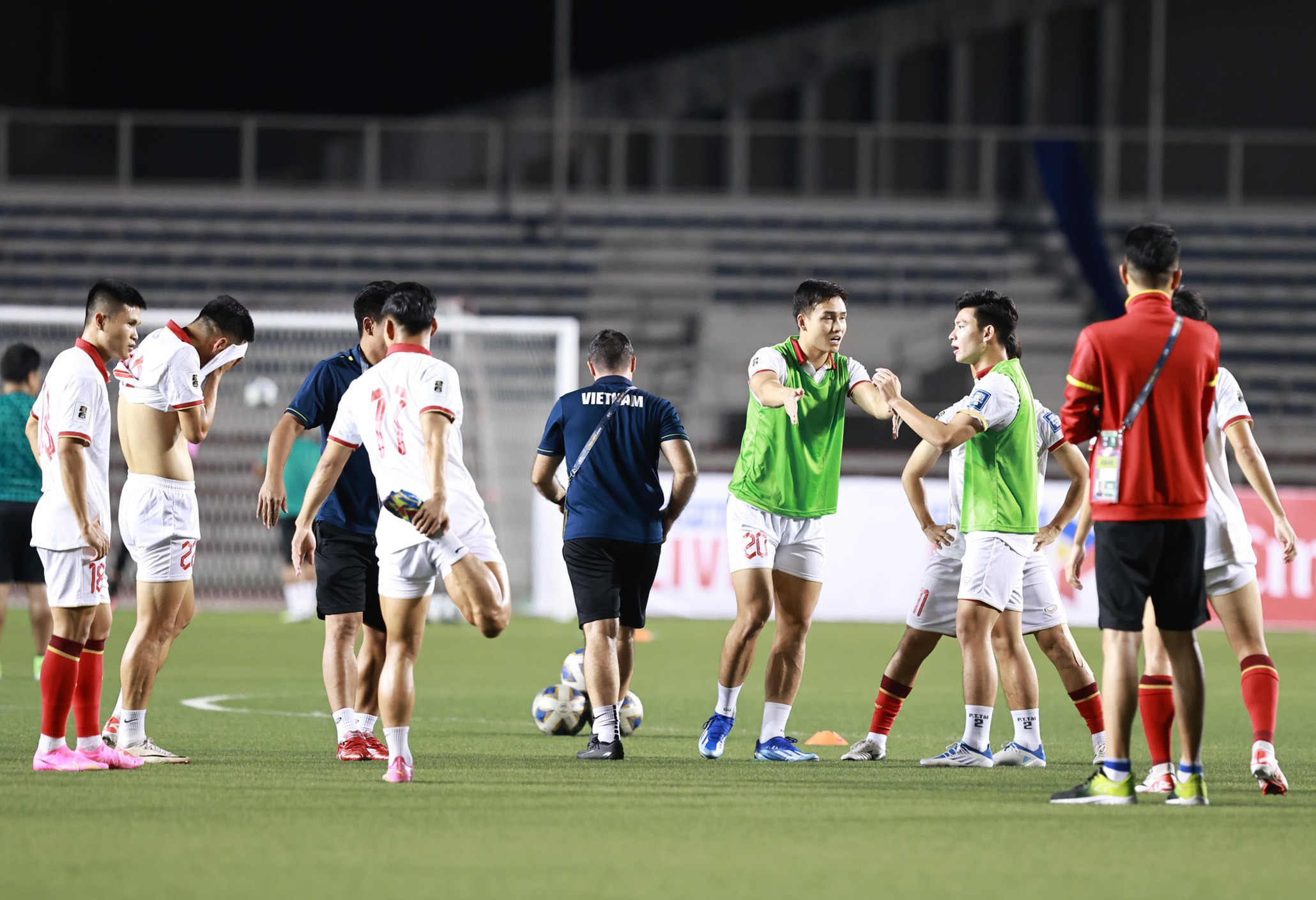 Các tuyển thủ Việt Nam khởi động trước trận đấu. Ảnh: Hồ Hải Hoàng