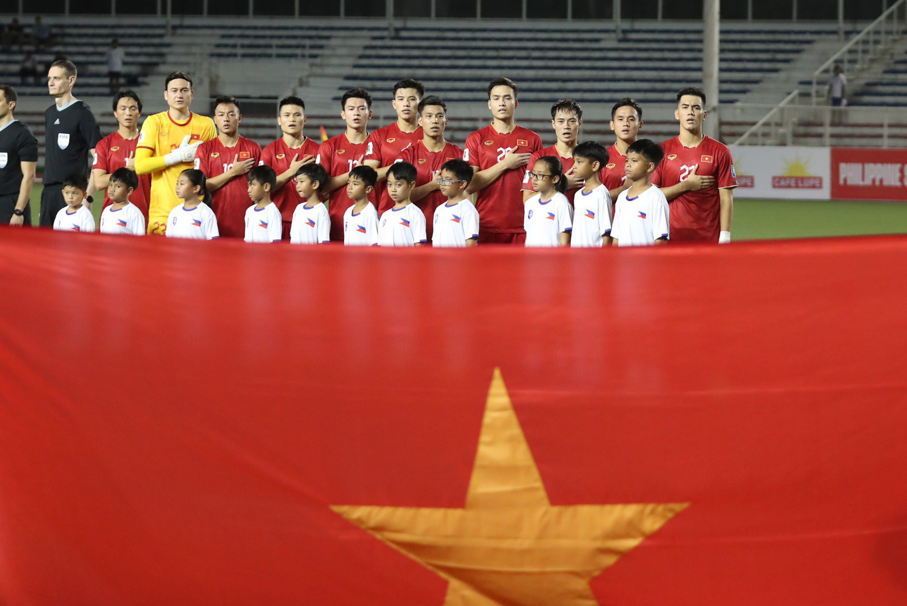 Hai đội tuyển bước ra sân làm thủ tục trước trận đấu. Ở trận này, tuyển Việt Nam mặc trang phục màu đỏ truyền thống, trong khi tuyển Philippines mặc trang phục màu trắng - đỏ - xanh.