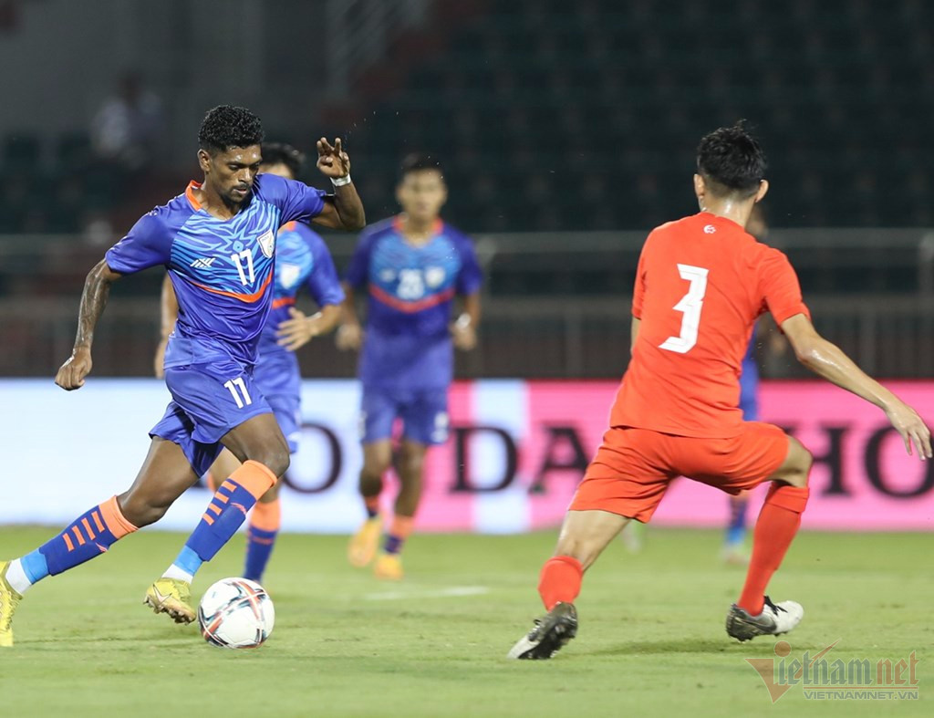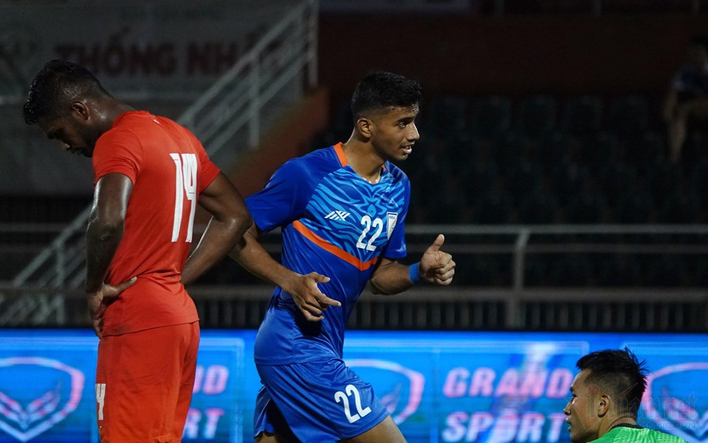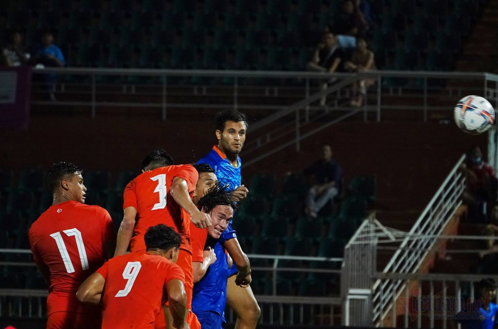 Các cầu thủ Ấn Độ đang chủ động đẩy cao đội hình chơi pressing ngay bên phần sân của Singapore.
