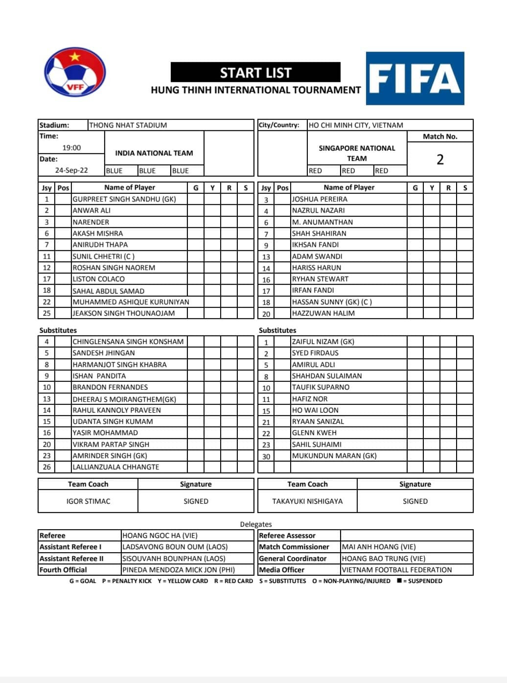 Ấn Độ: Gurpreet Sandhu, Anwar Ali, Narender, Akash Mishra, Aniruth Thapa, Sunil Chhetri, Roshan Naorem, Liston Colaco, Sahal Samad, Muhammed Kuruniyan, Jeakson Thounaojam