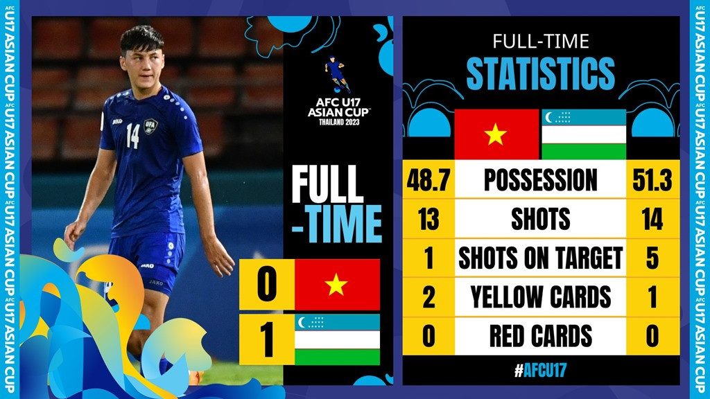 Trận đấu kết thúc, U17 Việt Nam không thể gây bất ngờ khi nhận thất bại 0-1 trước U17 Uzbekistan, qua đó bị loại ngay từ vòng bảng VCK U17 châu Á 2023.