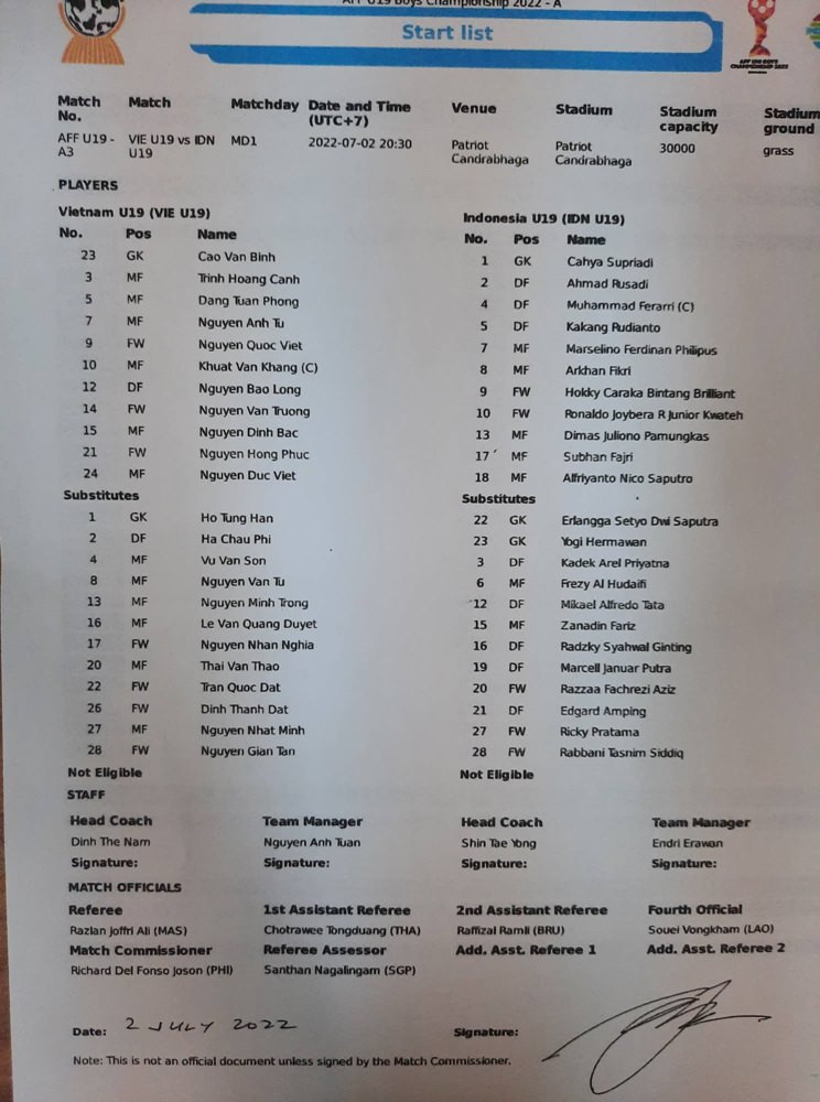 U19 Indonesia: Cahya, Ahmad Rusadi, Ferrari, Rudianto, Fikri, Marselino Ferdinan, Juliono, Fajri, Nico Saputro, Caraka Bintang, Ronaldo Kwateh.