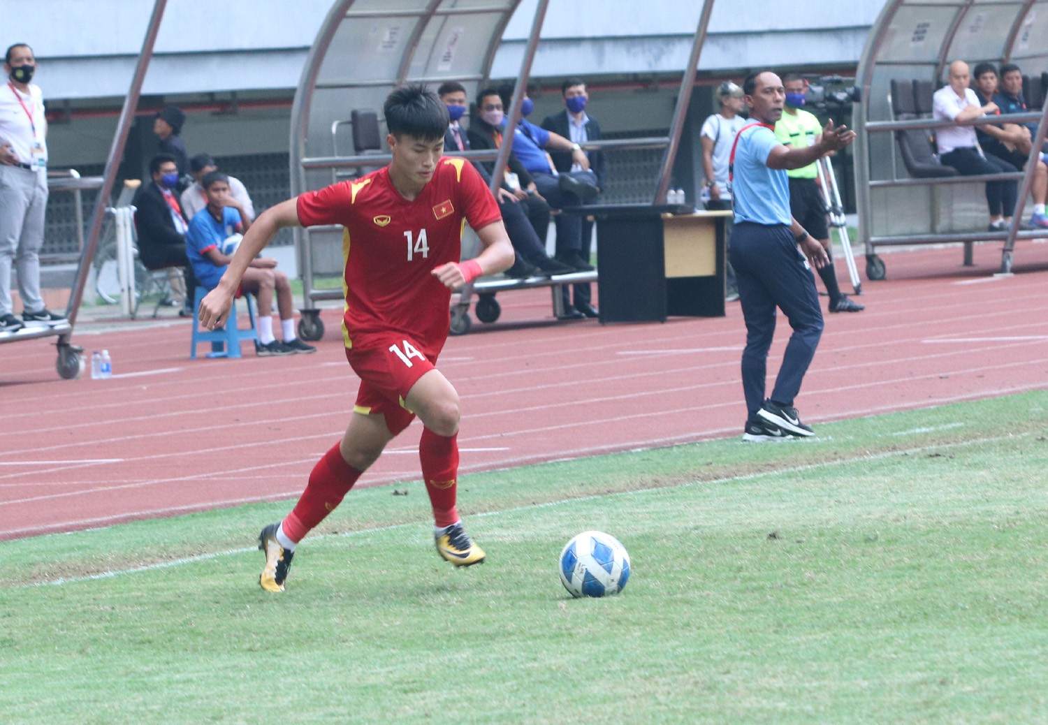 Các cầu thủ U19 Việt Nam đang kiểm soát tốt thế trận. Anh Tú vừa có pha dứt điểm từ tình huống đá phạt góc của Văn Khang, anh đưa bóng đi không trúng đích.