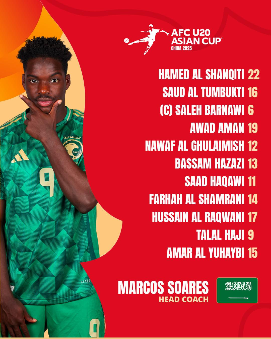 U20 Saudi Arabia: Alghmadi, Almadani, Alessa, Haji, Barnawi, Harun, Aman, Alharri, Alkhaibari, Shamrani, Haqawi.