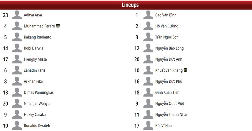 U20 Việt Nam: Cao Văn Bình, Văn Cường, Ngọc Sơn, Đức Anh (Hiểu Minh 90'), Bảo Long, Đức Phú (Thái Sơn 90'), Xuân Tiến, Văn Khang, Thanh Nhàn, Vĩ Hào, Quốc Việt (Quốc Việt 65')