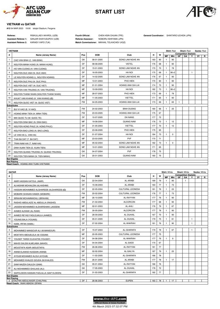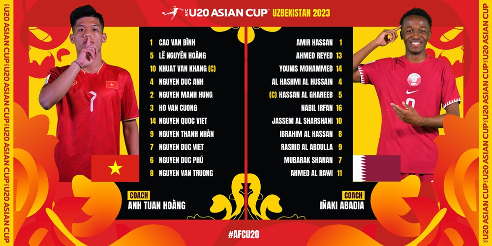 Đội hình xuất phát U20 Việt Nam vs U20 Qatar