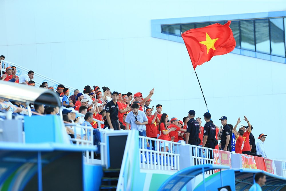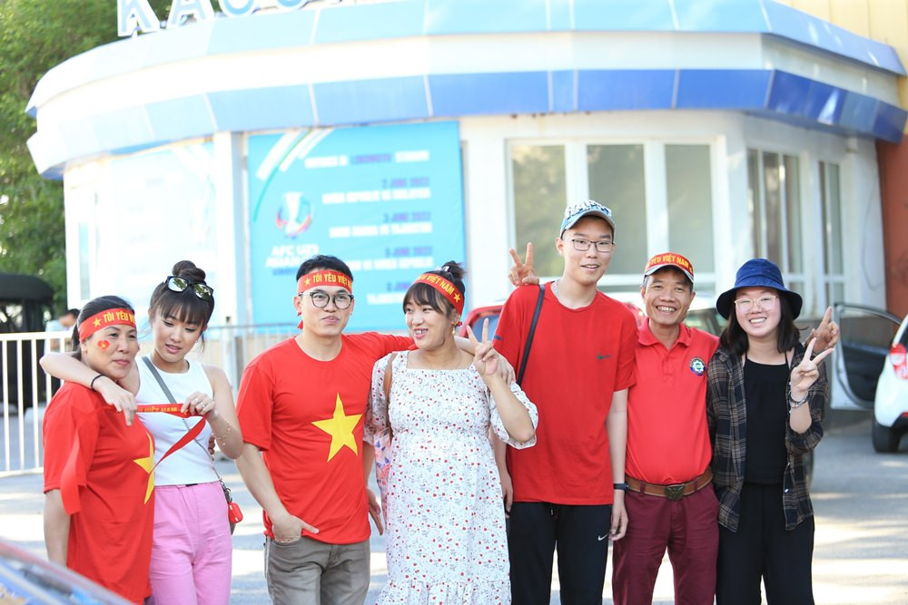 Cổ động viên Việt Nam vào sân vận động Lokomotiv Tashkent cổ vũ thầy trò HLV Gong Oh Kyun.