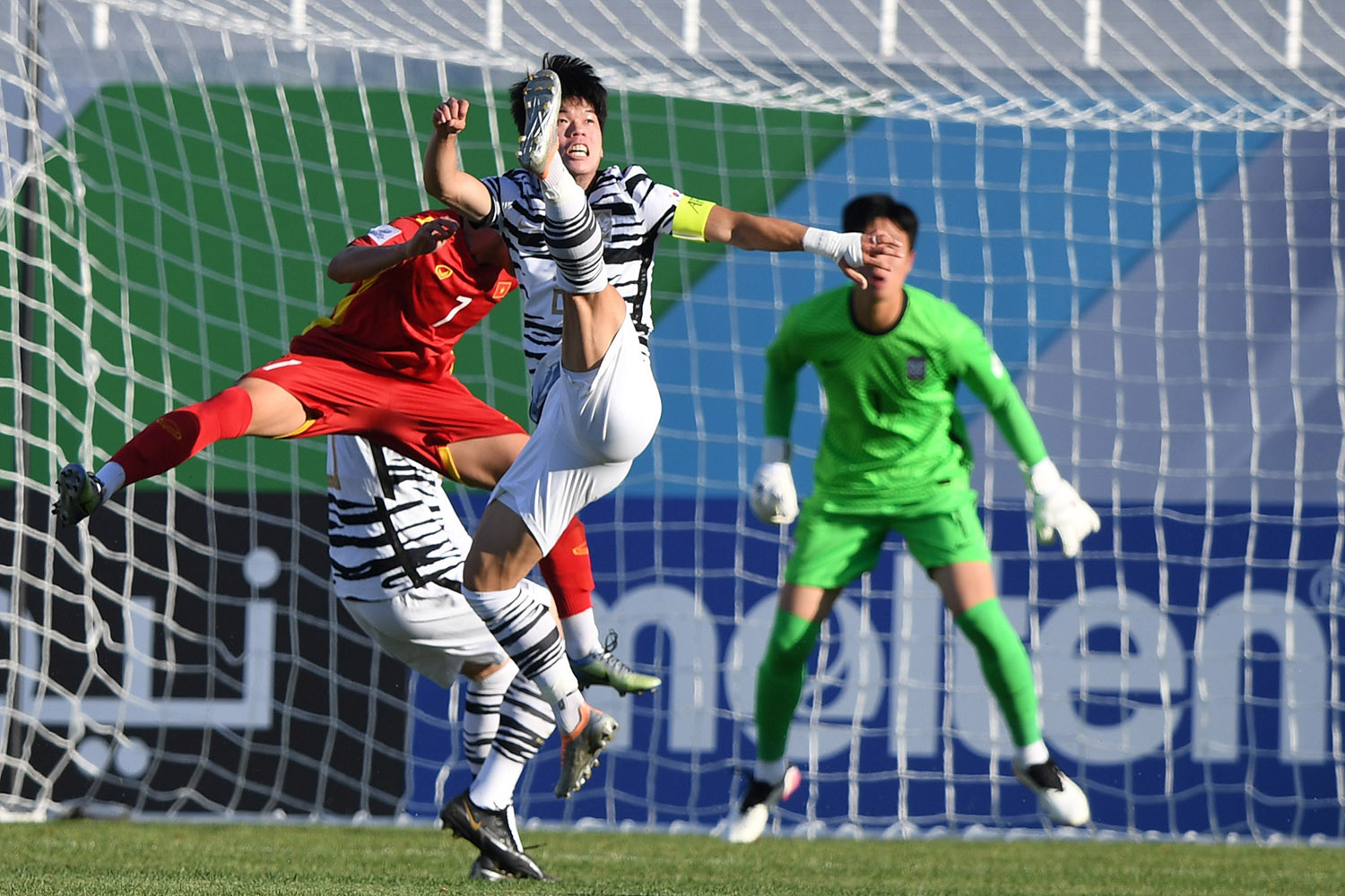 Trung vệ đội trưởng Bùi Hoàng Việt Anh lao về áp sát khiến cú sút của cầu thủ U23 Hàn Quốc đưa bóng đi nhẹ và thủ thành Văn Chuẩn dễ dàng bắt gọn trái bóng.