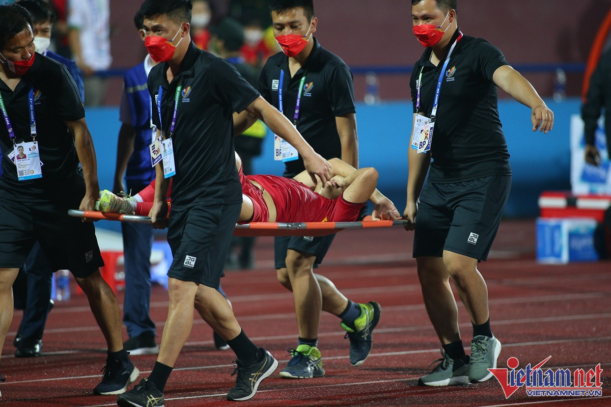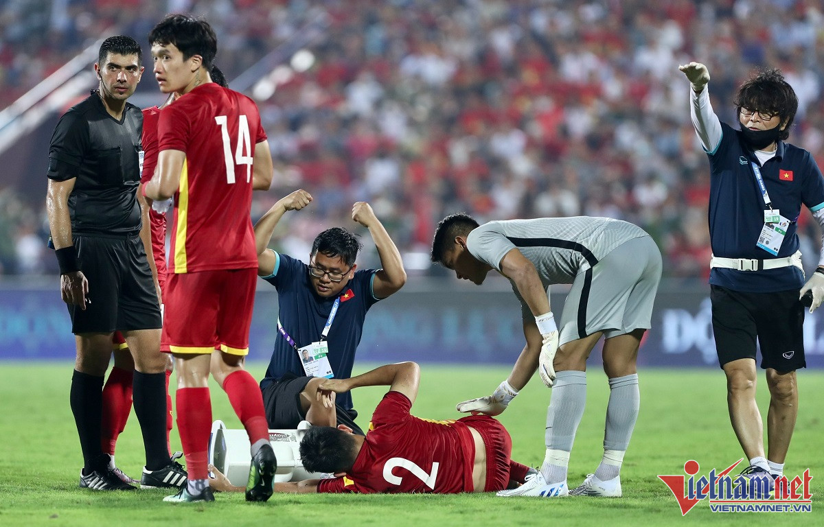 Văn Xuân bị đau ở vùng đùi sau pha vào bóng rất quyết liệt của cầu cầu thủ U23 Malaysia. Anh không thể tiếp tục thi đấu buộc HLV Park Hang Seo tung Tuấn Tài vào thế chỗ.