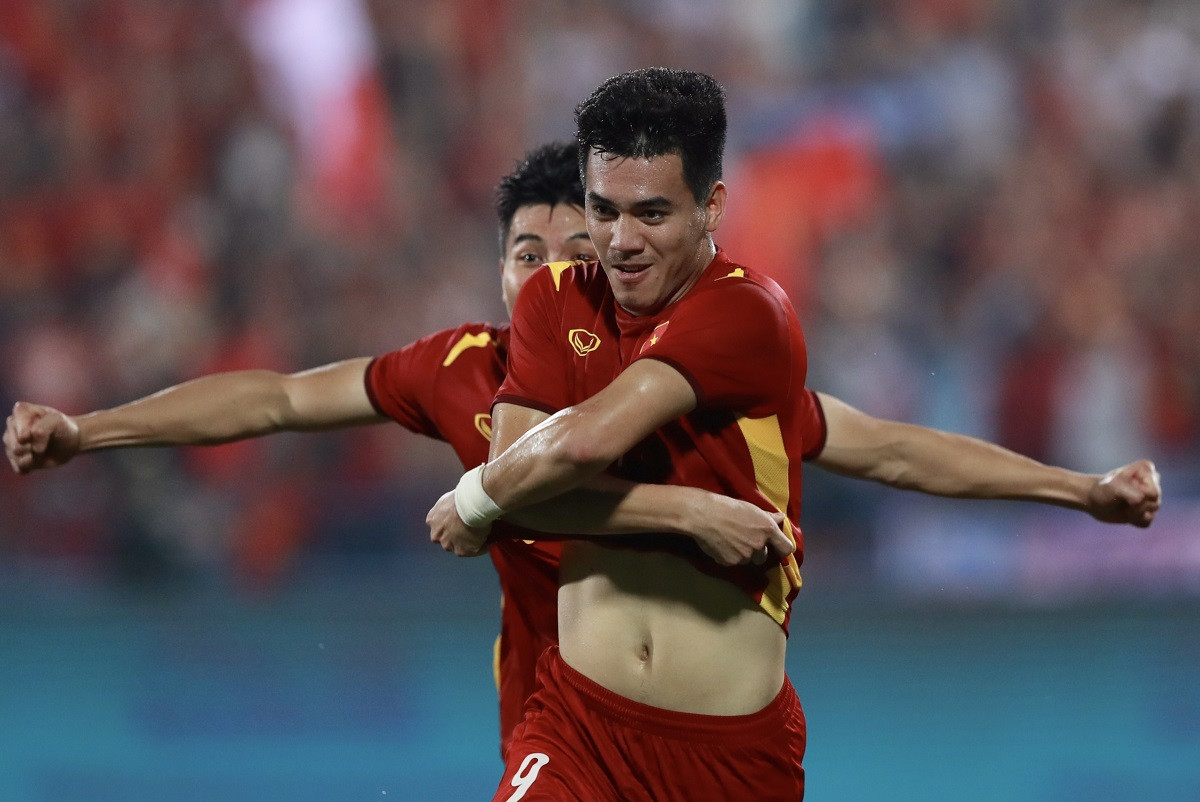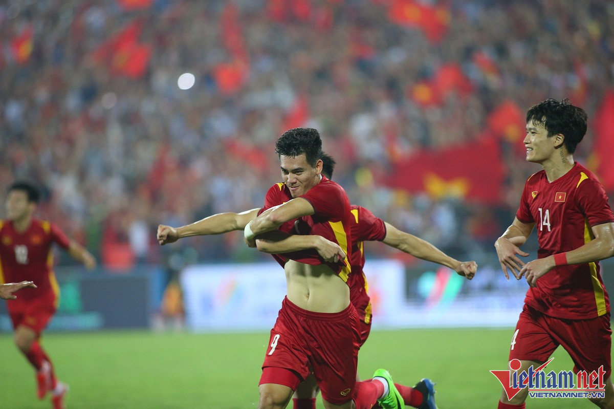 Từ pha treo bóng của đội trưởng Hùng Dũng, tiền đạo Tiến Linh bật cao đánh đầu tung lưới U23 Malaysia. Quá phấn khích, tiền đạo mang áo số 9 cởi áo ăn mừng và phải nhận thẻ vàng.