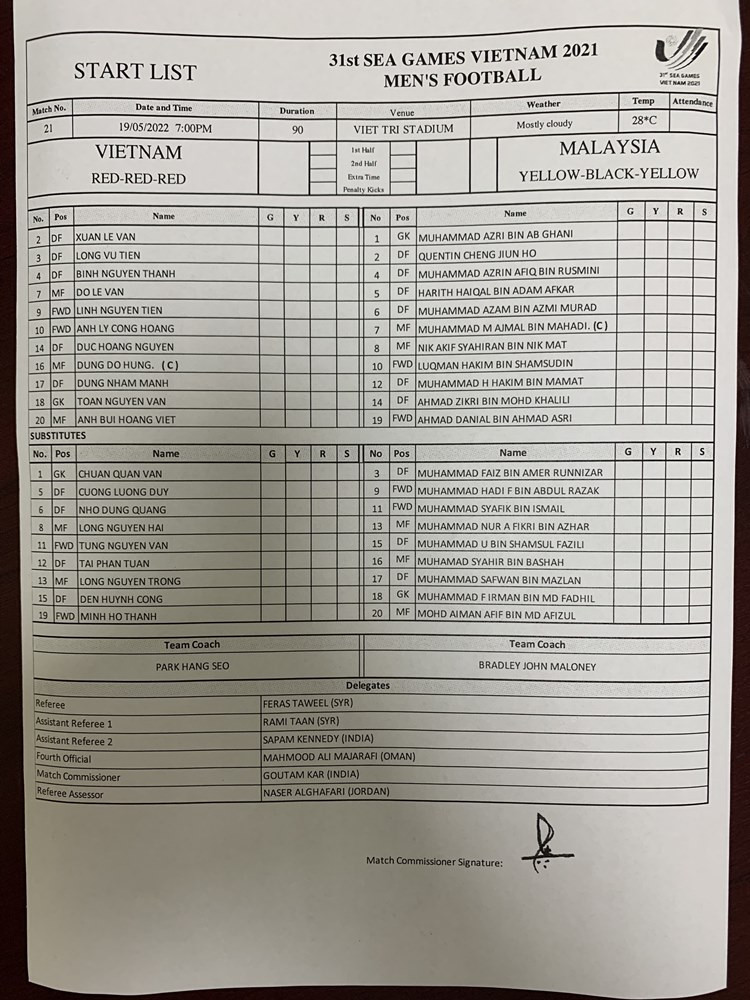 U23 Malaysia: Arzri Ab Ghani; Azrin Afiq, Harith Haiqal, Azam Azmi, Syahir Bashah, Mukhairi Ajmal, Nik Akif Syahiran, Danial Asri, Mukhairi Ajmal, Luqman Hakim, Hadi Fayyadh.