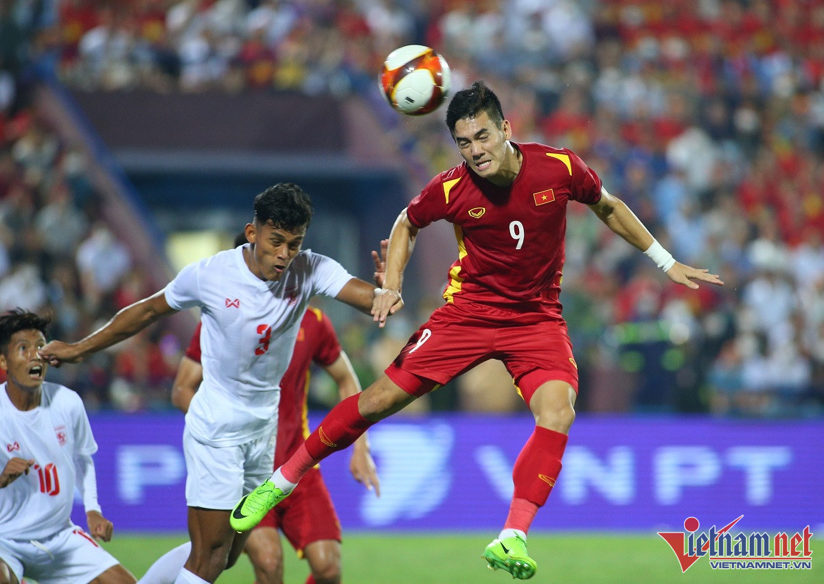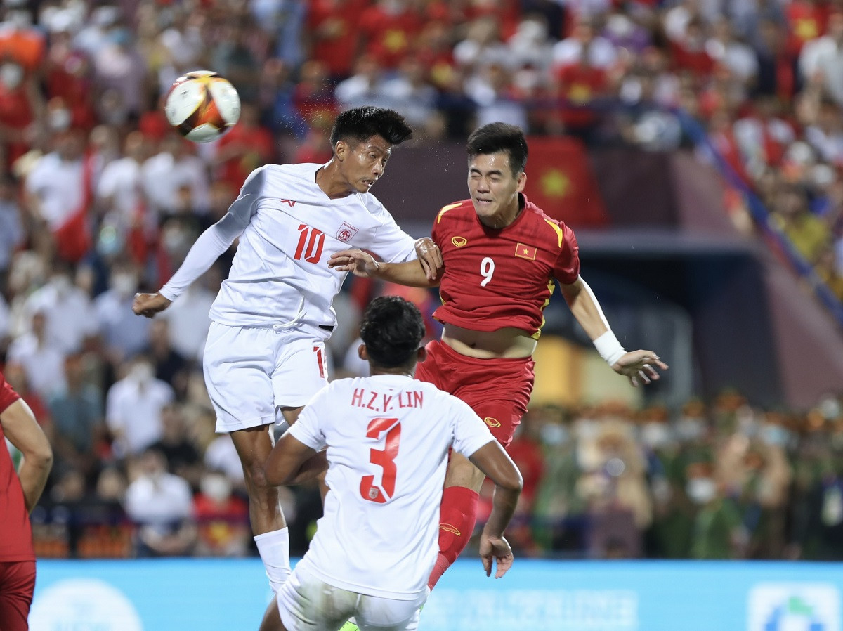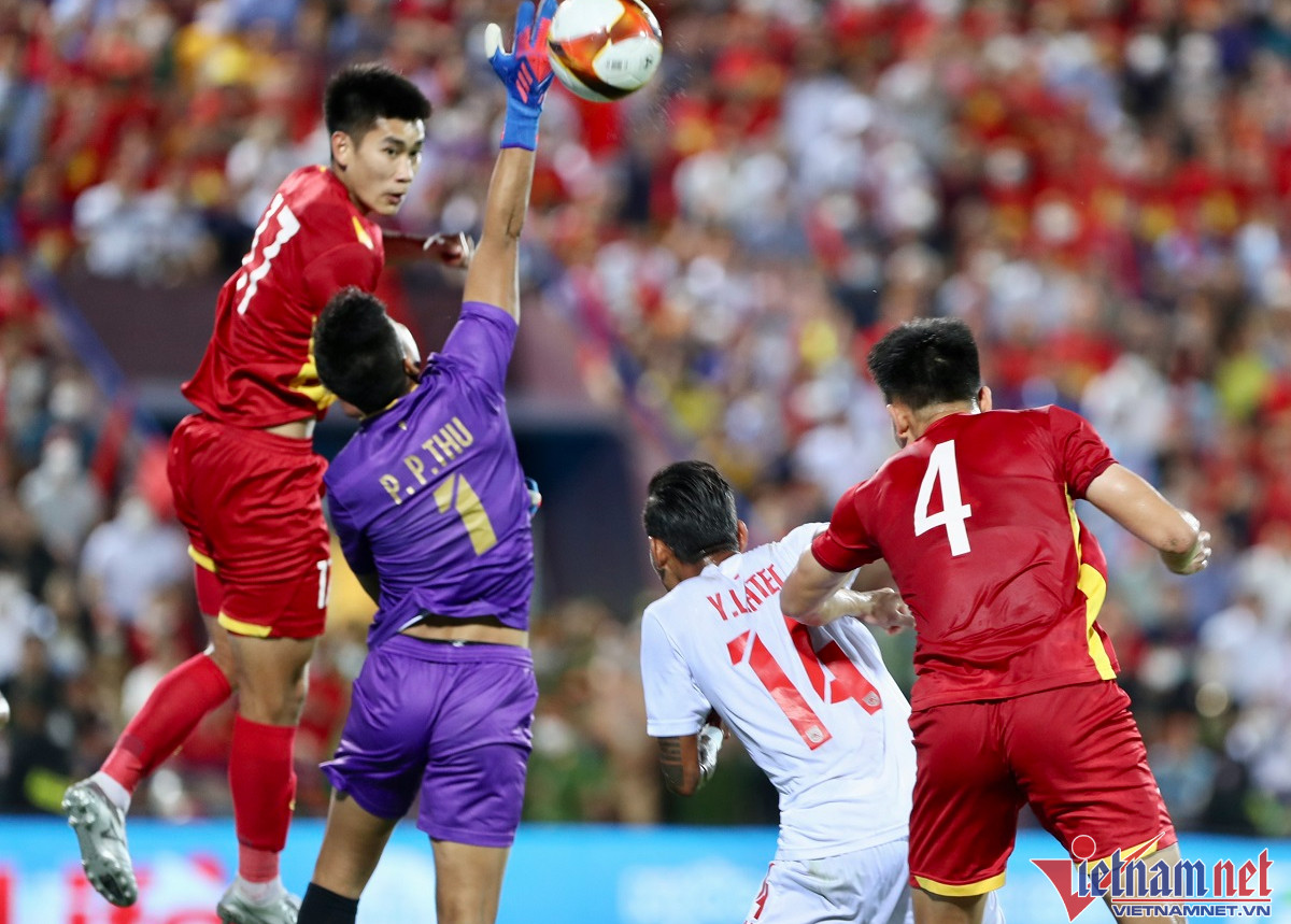 Cơ hội liên tiếp dành cho U23 Việt Nam, Hùng Dũng tạt bổng để Tiến Linh bật cao đánh đầu nhưng không đánh bại được thủ môn Pyae Phyo Thu.