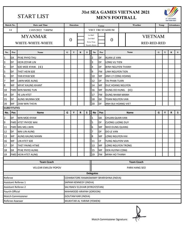 U23 Việt Nam: Văn Toản, Việt Anh, Thanh Bình, Tuấn Tài, Tiến Long (Văn Đô 46'), Hùng Dũng, Hoàng Đức, Hoàng Anh, Văn Xuân, Tiến Linh, Nhâm Mạnh Dũng