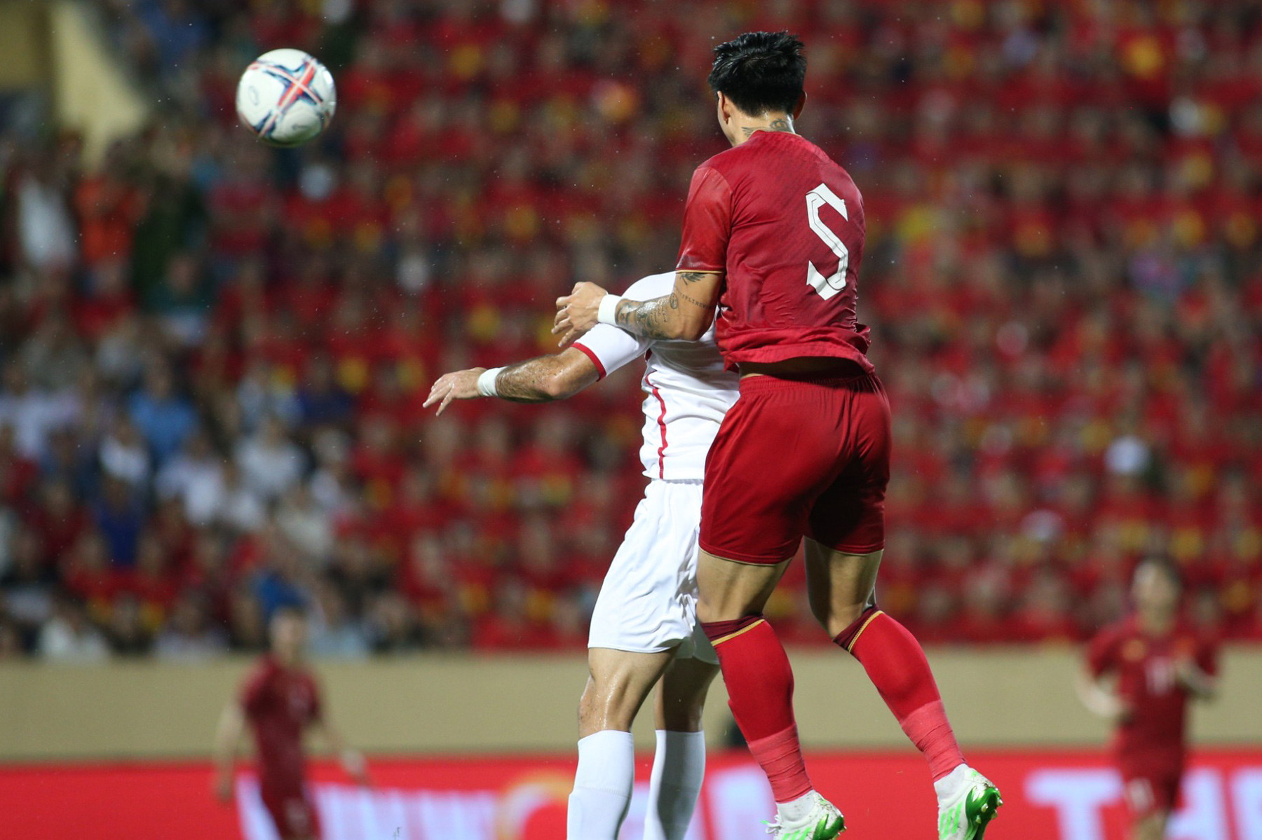 Từ đường chuyền bên cánh trái, Văn Tùng bật cao đánh đầu không thành công. Số 7 của Việt Nam dường như muốn chuyền cho đồng đội hơn là dứt điểm.