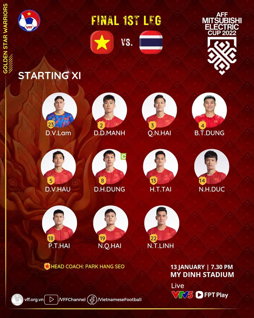 - Ở chung kết lượt đi diễn ra tối 13/1, tuyển Việt Nam có lực lượng mạnh nhất. Trong khi khả năng ra sân của Dangda bên phía Thái Lan còn bỏ ngỏ.