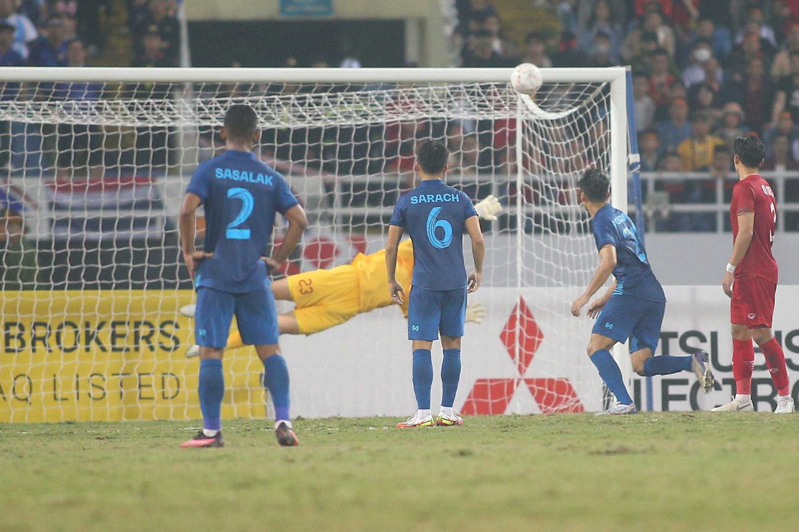 Đội trưởng Theerathon Bunmathan thực hiện cú đá phạt rất căng đưa bóng trúng xà ngang khung thành Văn Lâm bật ra.