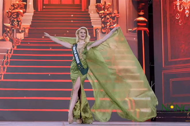 Top 12 gồm các thí sinh từ Albania, Brazil, Indonesia, Kazakhstan, Hà Lan, Philippines, Puerto Rico, Nga, Nam Phi, Thái Lan, Venezuela và Việt Nam cùng tham gia phần thi trang phục dạ hội. Các người đẹp tỏa sáng với những chiếc váy dạ hội kết hợp tinh tế giữa ren và đá quý, tôn lên vẻ đẹp lộng lẫy của từng thí sinh.