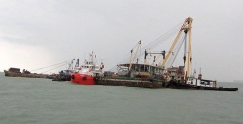 | 3 cần cẩu với công suất 550 tấn được huy động trục vớt tàu. |