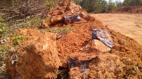 Theo quan sát của PV tại hiện trường, rất nhiều các khối đá nghi quặng sắt bị các đối tượng đào nằm lộ thiên và rải rác khắp khu vực đồi cao su của một số hộ dân thôn Phú Mậu.