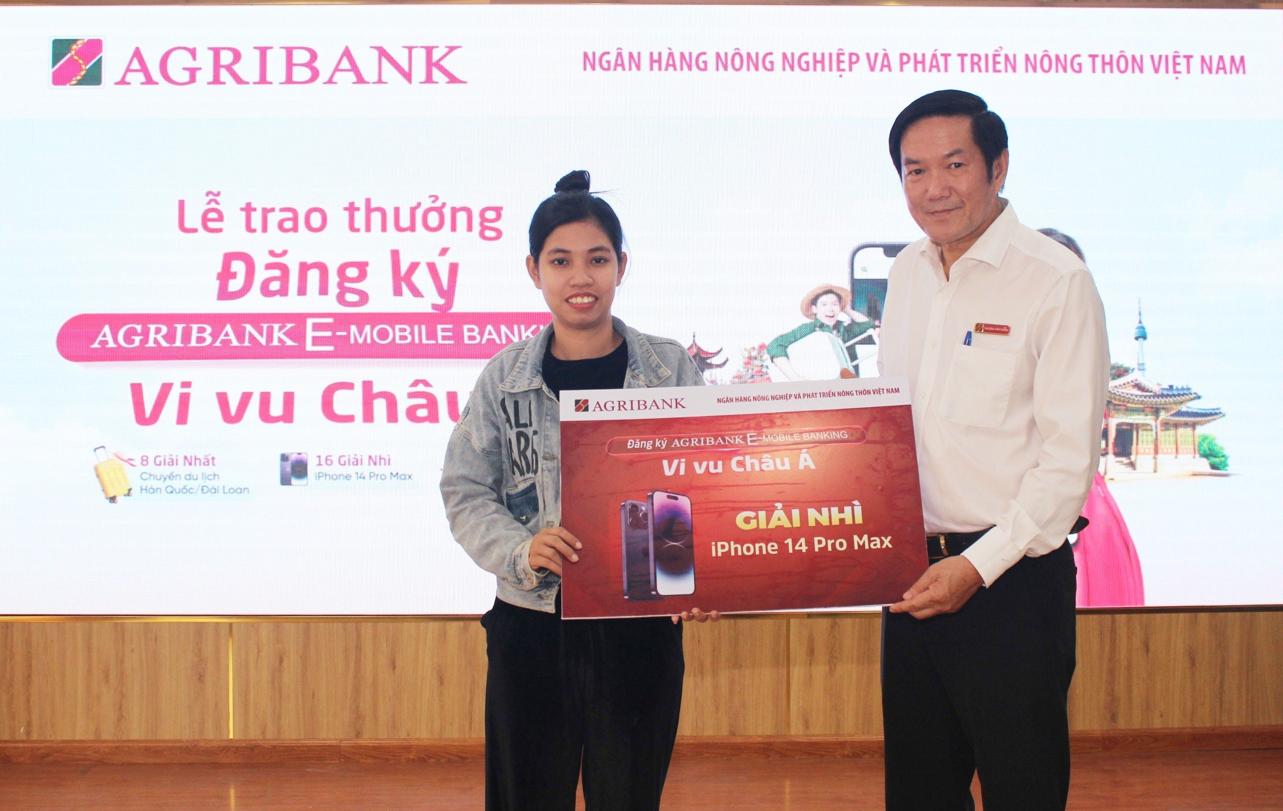 Theo đó trong chương trình quay số mỗi tuần sẽ có 01 chuyến du lịch 2 người tới Hàn Quốc hoặc Đài Loan; 02 iPhone 14 Pro Max và 60 mã giảm giá 1 triệu đồng mua sắm VnShop trên ứng dụng dành cho các khách hàng mới đăng ký, kích hoạt thành công dịch vụ Agribank E-Mobile Banking.