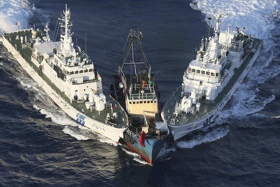 Hai tàu tuần tra của Nhật chặn tàu chở các nhà hoạt động của Hong Kong muốn tiếp cận quần đảo Senkaku/Điếu Ngư hồi tháng Tám vừa qua. Ảnh: AP |