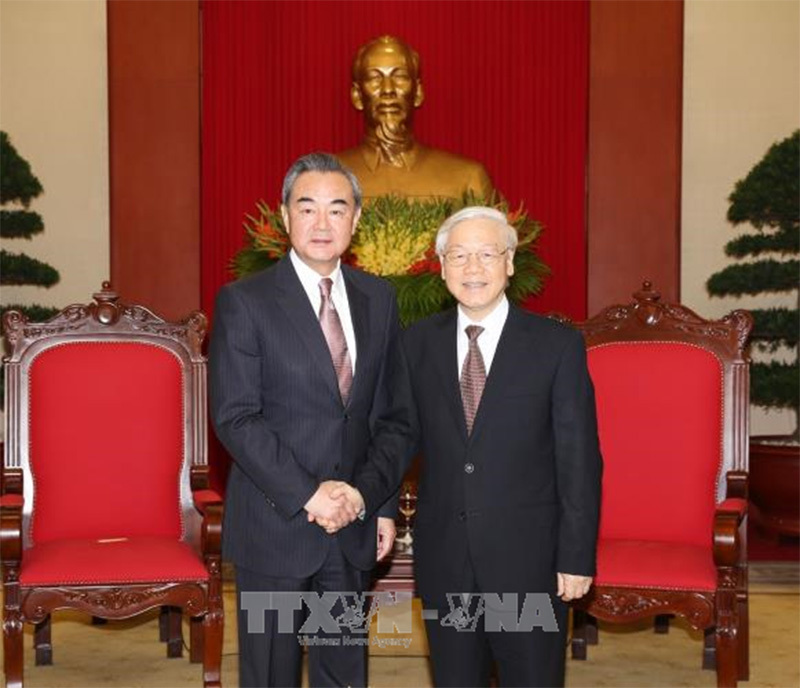 | Tổng Bí thư Nguyễn Phú Trọng tiếp thân mật Bộ trưởng Ngoại giao Trung Quốc Vương Nghị. Ảnh: TTXVN |