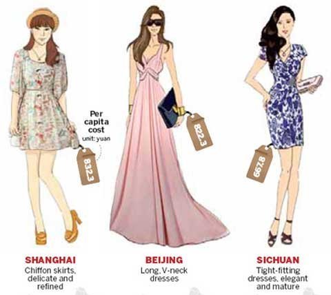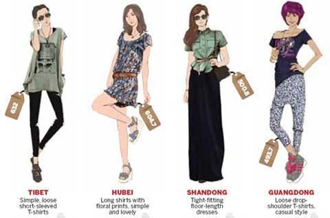 Những người phụ nữ thích những chiếc váy ngắn, nhìn khêu gợi, bó sát và nhiều màu thường là phụ nữ Trùng Khánh, thành phố nổi tiếng với đồ ăn cay xè, phụ nữ ở Lanzhou, tỉnh Gansu phía tây bắc Trung Quốc, thường thích đồ đơn giản, nhưng là những chiếc váy thêu tay thanh nhã.