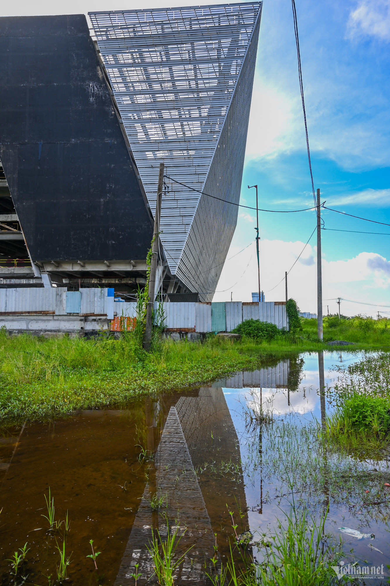 Sau 10 năm thi công dang dở, công trình Trung tâm triển lãm quy hoạch TP.HCM đã nhuốm màu đen cũ kỹ, cỏ dại mọc um tùm, nước đọng đầy mặt sân.