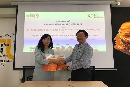 Bà Hoàng Thị Kiêu Huyền, Trưởng đại diện tại Hà Nội Quỹ khởi nghiệp Doanh nghiệp khoa học và công nghệ Việt Nam công bố chương trình tài trợ năm 2019 và ký kết ký kết hợp tác với Ông Lý Đình Quân Giám đốc Songhan Incubator |