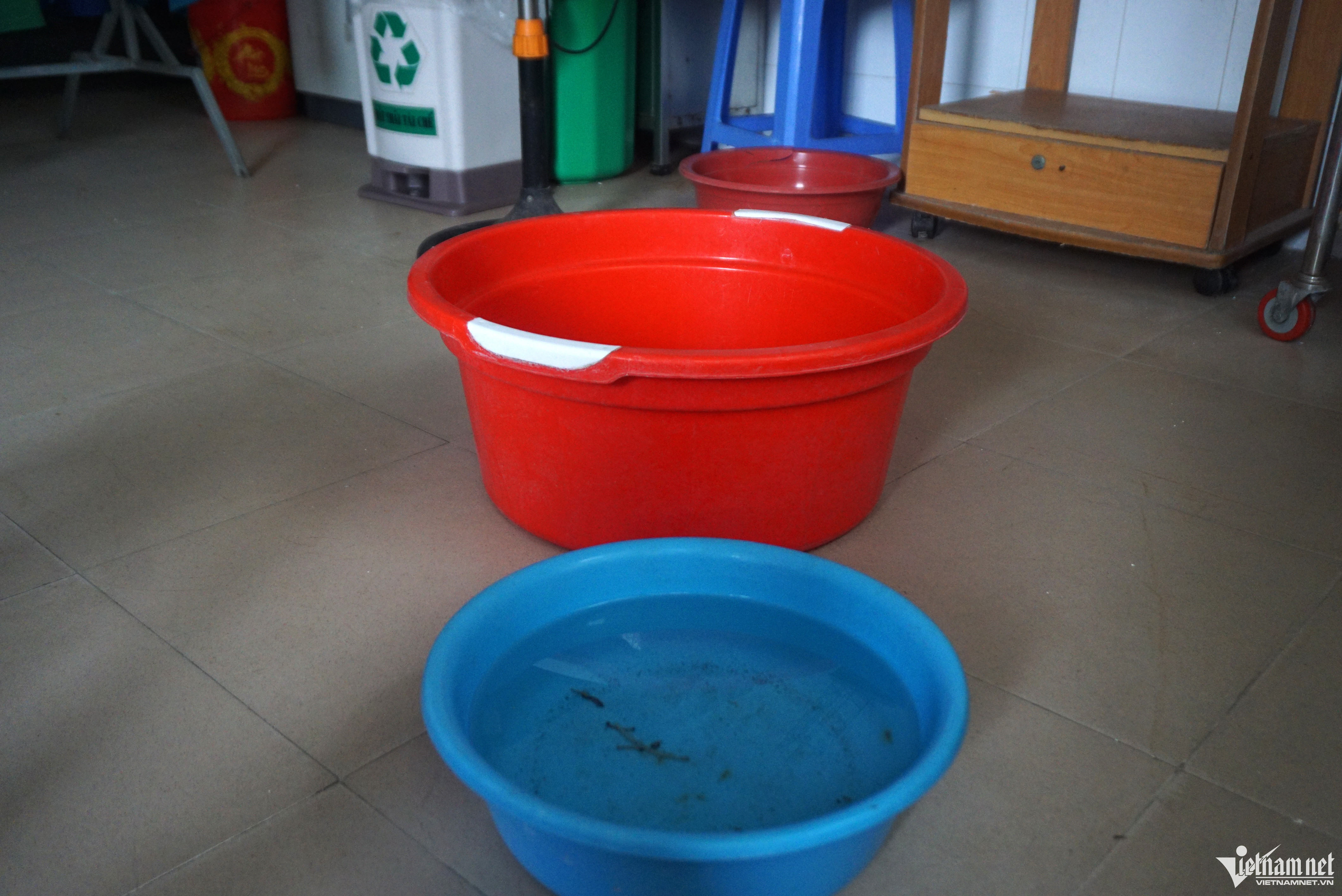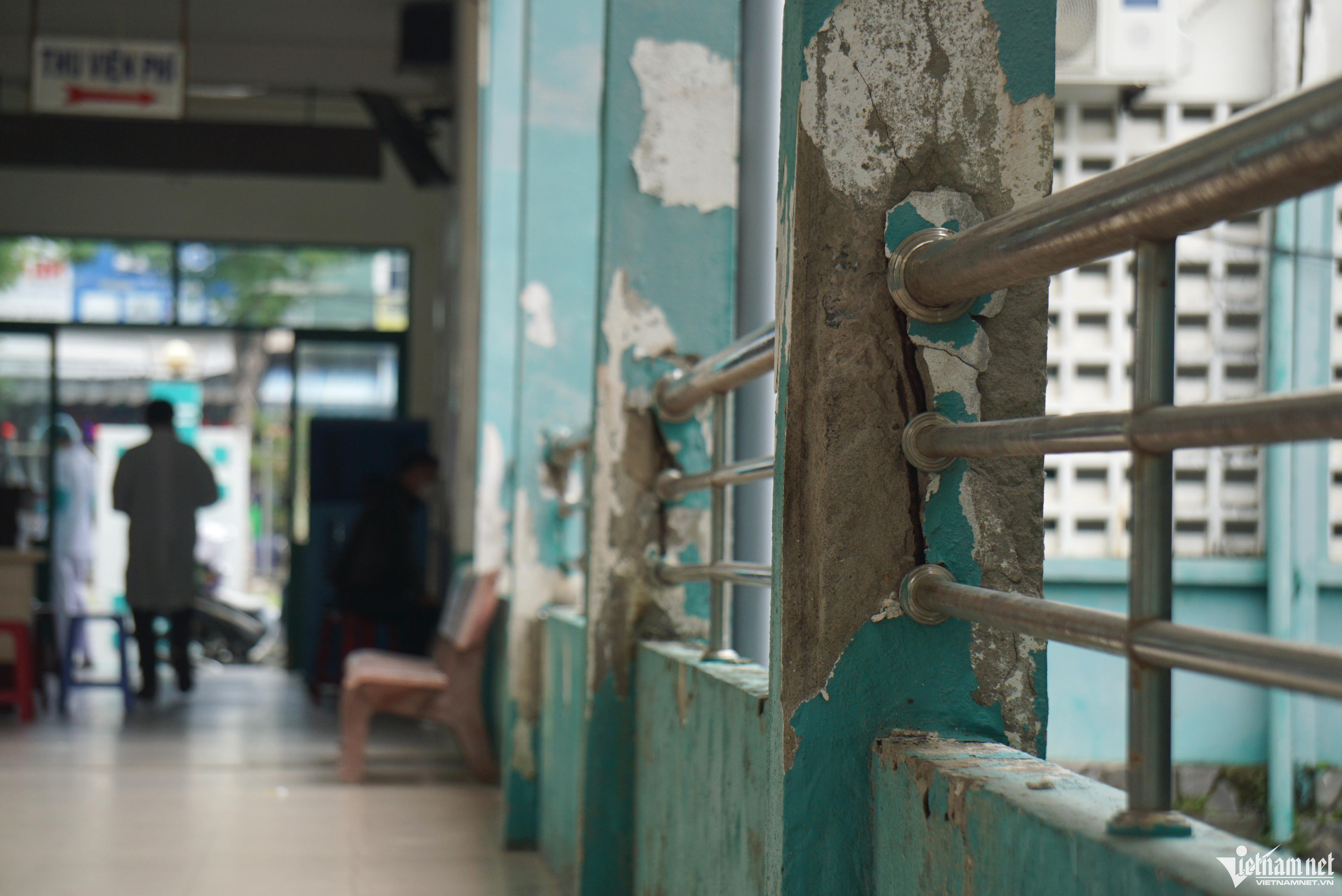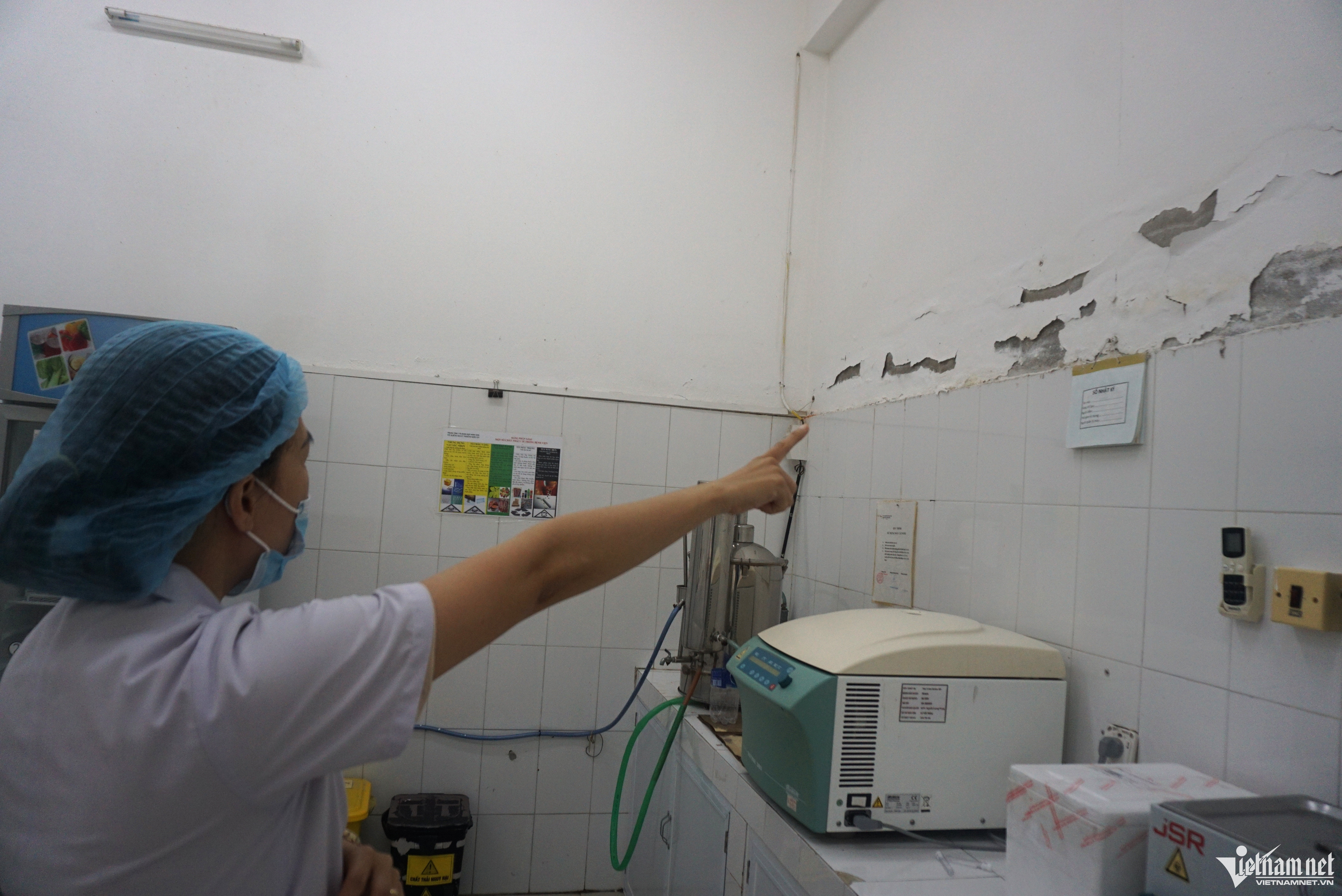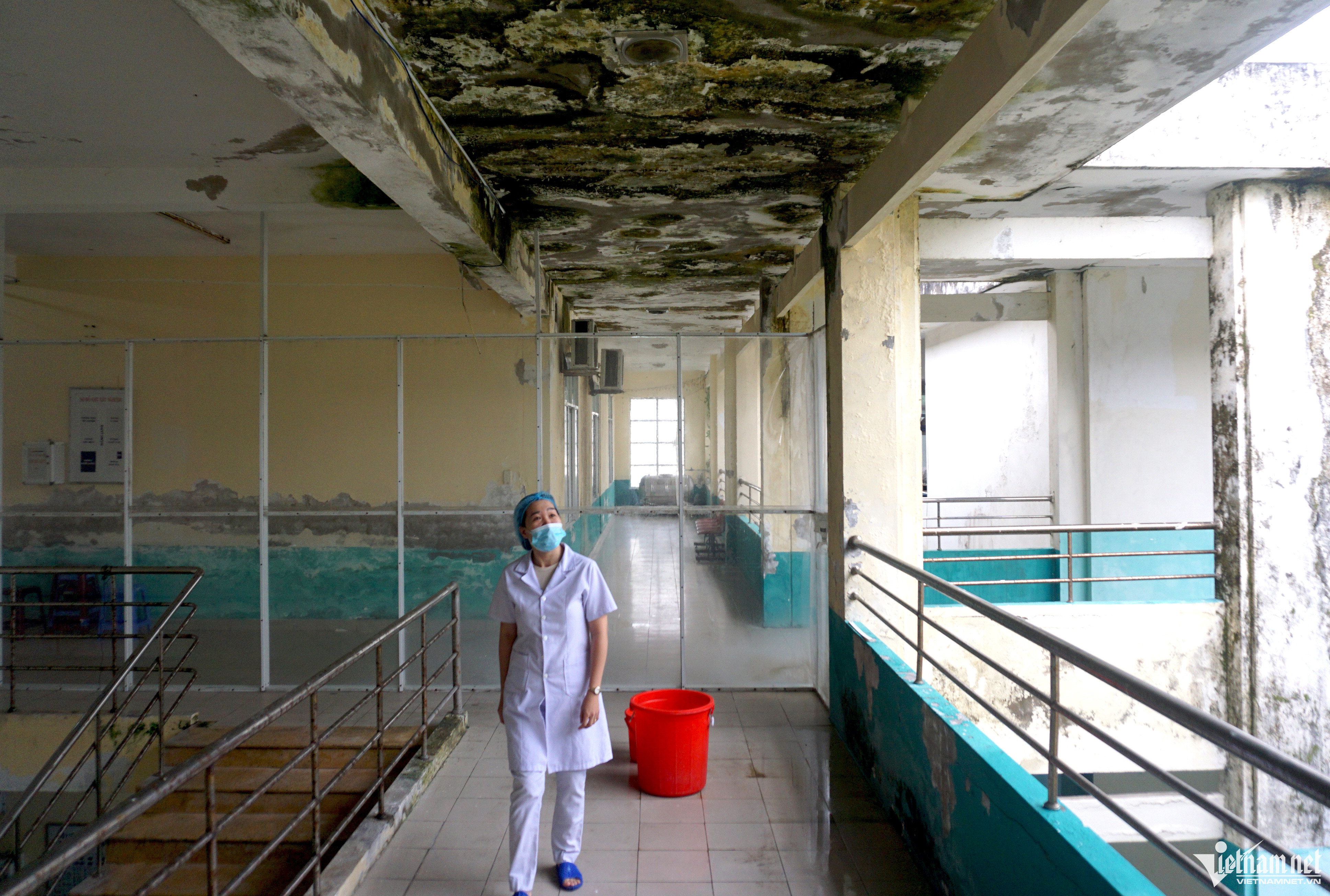 Các bức tường và trần nhà Trung tâm Y tế quận Ngũ Hành Sơn (Đà Nẵng) đang xuống cấp nghiêm trọng, nhân viên y tế phải dùng xô hứng nước mỗi khi có mưa.