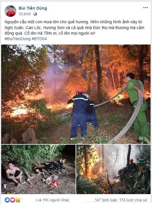 Bài của trung vệ Bùi Tiến Dũng được rất nhiều người tham gia chia sẻ. Thành viên Thiều Hải viết: "Cảm ơn bạn những người lính cứu hỏa các anh đã chấp nhận hi sinh tính mạng chỉ để giữ màu xanh cho quê hương Hà Tĩnh và đất nước Việt Nam".