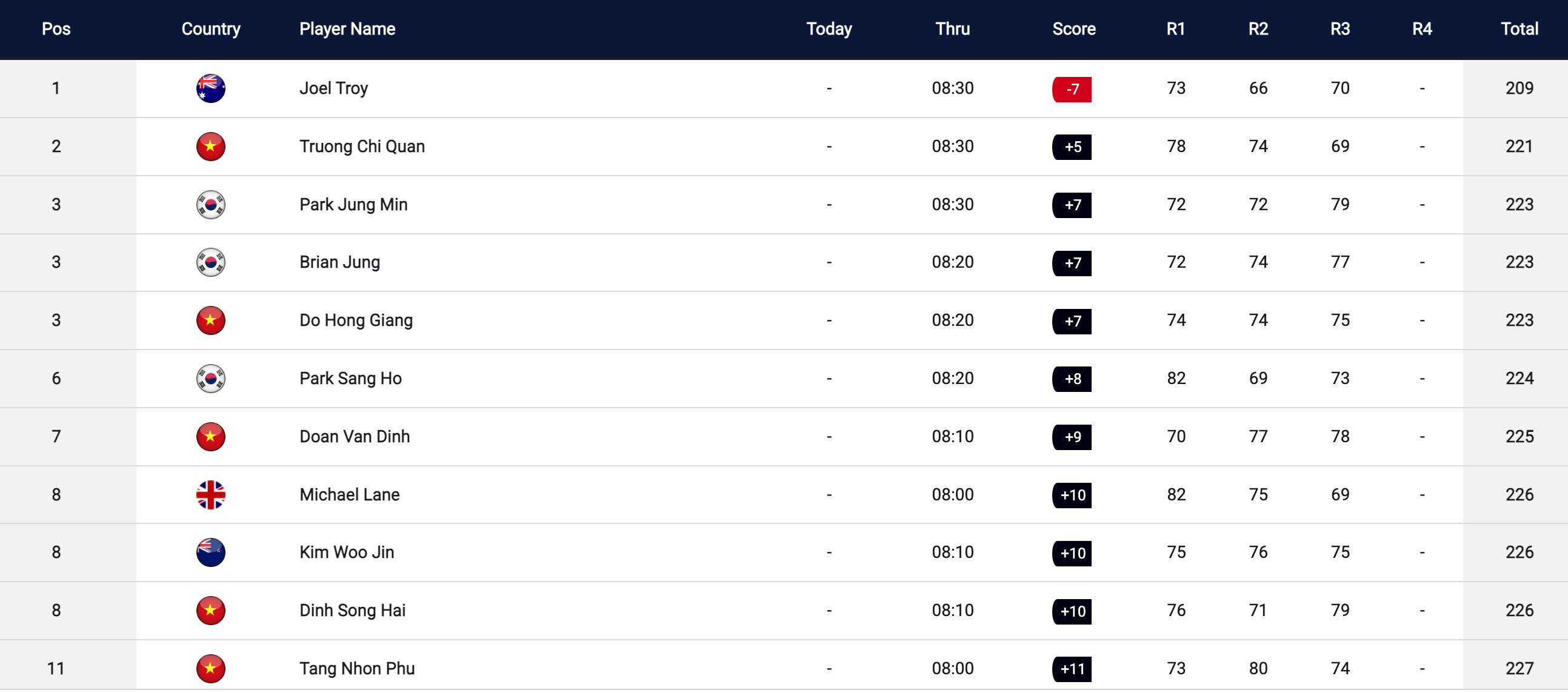 Với kết quả tổng điểm -7 và 12 gậy cách biệt so với người xếp thứ 2 sau 3 ngày thi đấu, Joel Troy gần như chắc chắn sẽ trở thành nhà vô địch của sự kiện chung kết mùa giải VGA Tour 2022 và nhận về phần thưởng trị giá 500 triệu đồng.