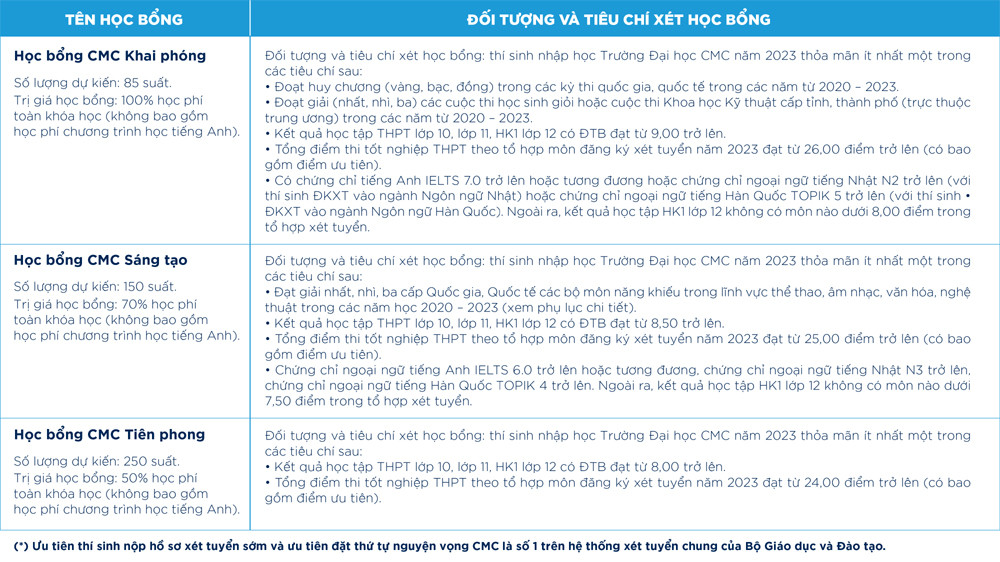Quỹ học bổng “CMC - Vì bạn xứng đáng” tổng trị giá 92 tỷ đồng với số lượng hơn 500 suất sẽ được trao cho các thí sinh có thành tích học tập xuất sắc. Cụ thể, với điểm trung bình lớp 10, lớp 11 và học kỳ 1 của lớp 12 từ 8,00 trở lên hoặc tổng điểm thi tốt nghiệp THPT theo tổ hợp môn ĐKXT năm 2023 đạt từ 24,00 điểm trở lên (có bao gồm điểm ưu tiên), thí sinh đã đủ điều kiện tham gia xét các suất học bổng trị giá lên đến 100% học phí toàn khóa trong suốt quá trình học tập tại trường.