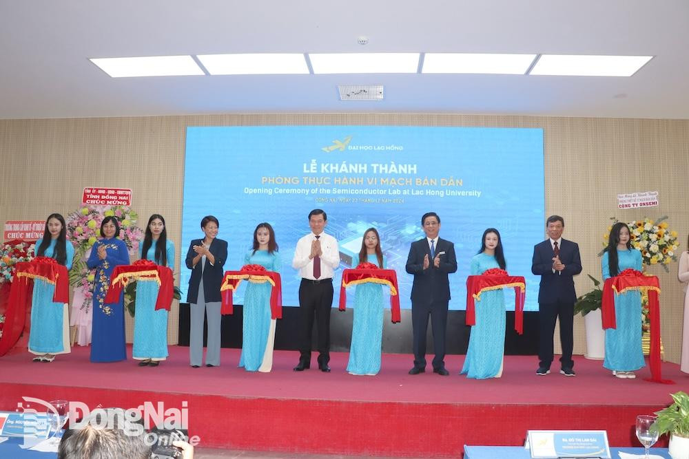 | Lãnh đạo tỉnh và lãnh đạo trường cắt băng khánh thành Phòng thực hành vi mạch bán dẫn Trường đại học Lạc Hồng. Ảnh: Hải Yến |