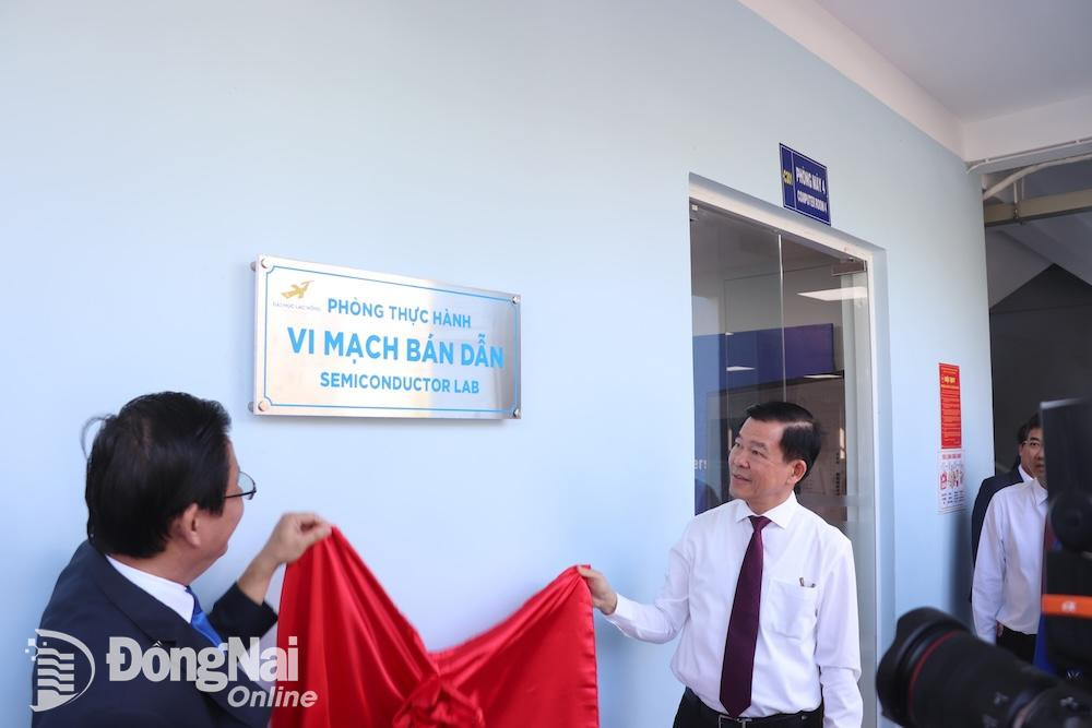 | Ủy viên Trung ương Đảng, Bí thư Tỉnh ủy Nguyễn Hồng Lĩnh và Hiệu trưởng Trường đại học Lạc Hồng Lâm Thành Hiển gỡ băng khánh thành Phòng thực hành vi mạch bán dẫn. Ảnh: Hải Yến |