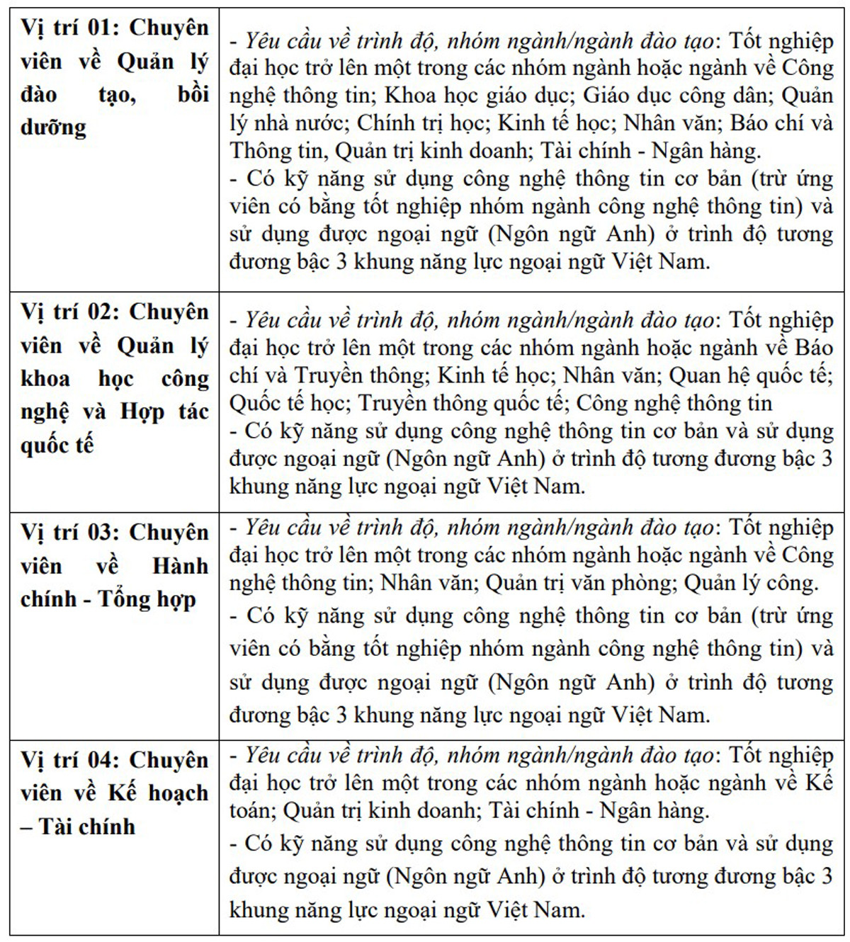 Cụ thể, trong đợt tuyển dụng viên chức này, Trường Đào tạo, Bồi dưỡng cán bộ quản lý TT&TT tuyển 9 chỉ tiêu cho 4 vị trí việc làm tại trường gồm: Chuyên viên Quản lý đào tạo, bồi dưỡng; Chuyên viên về Quản lý Khoa học công nghệ và Hợp tác quốc tế; Chuyên viên Hành chính -Tổng hợp; Chuyên viên Kế hoạch – Tài chính.