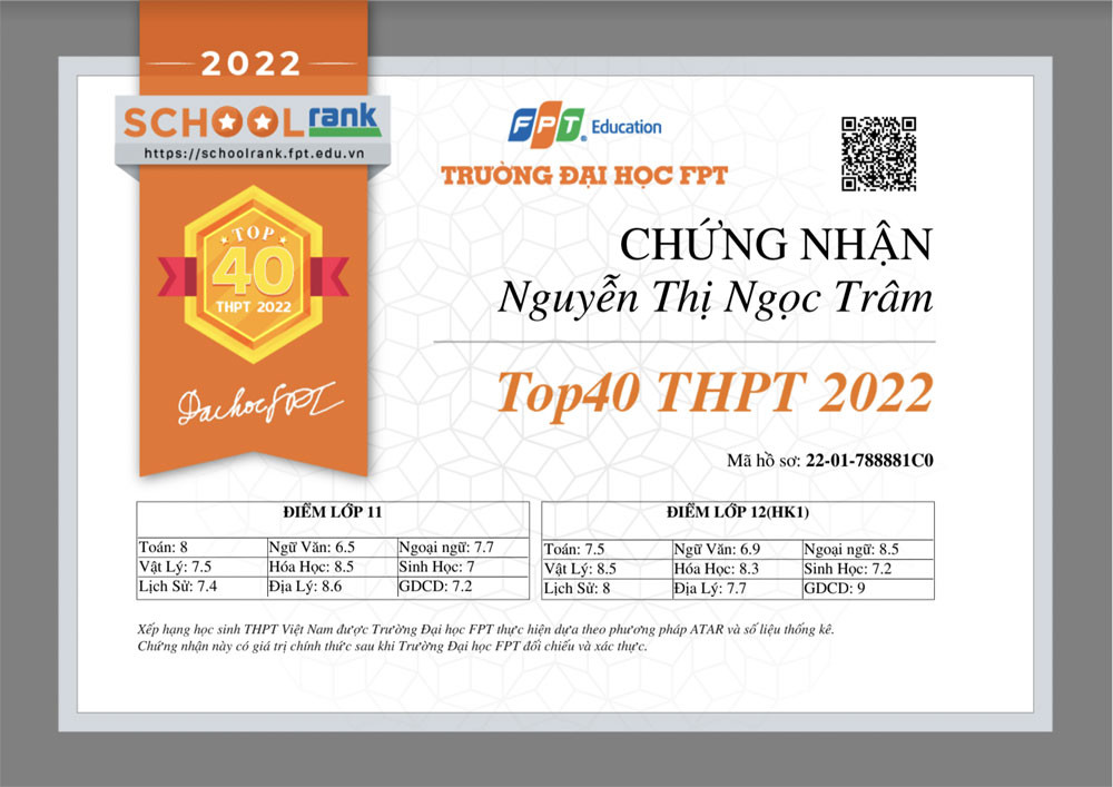 - Giấy chứng nhận xếp hạng SchoolRank trên trang https://SchoolRank.fpt.edu.vn (áp dụng với thí sinh xét tuyển theo xếp hạng SchoolRank 2022);