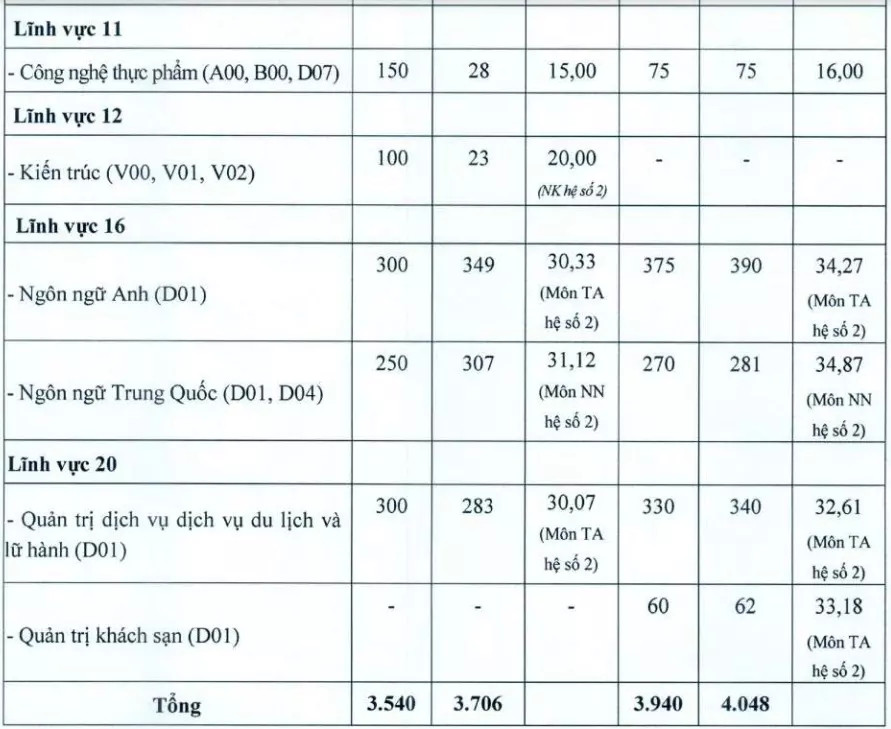 Trong số 18 ngành tuyển sinh, có 13 ngành chỉ sử dụng kết quả thi tốt nghiệp THPT. Ngoài ra, 4 ngành sử dụng cả 2 phương án kết quả thi THPT và kết quả học bạ gồm: Công nghệ Sinh học, Công nghệ Thực phẩm, Kiến trúc và Thiết kế Công nghiệp.