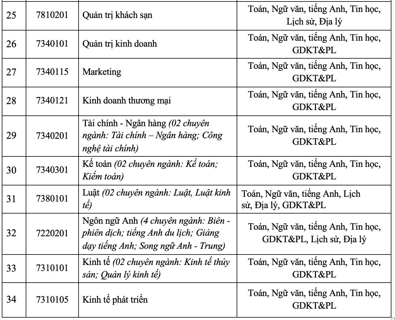Định hướng trong việc xác định tổ hợp môn xét tuyển như sau: Sử dụng tổ hợp có từ 3 đến 5 môn xét tuyển, trong đó, các môn Toán, Ngữ văn và tiếng Anh là 3 môn bắt buộc phải có trong mỗi tổ hợp xét tuyển. Sử dụng thang điểm 50.