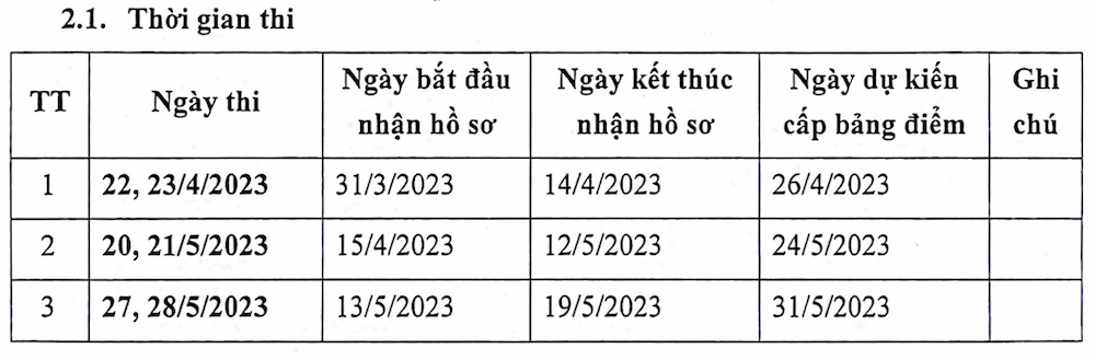 Kỳ thi được tổ chức 3 lần, trong tháng 4 và 5 như sau: