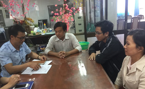 Thiện cùng mẹ đang được Thạc sĩ Đinh Xuân Tỏa (áo xanh) thông báo quyết định hỗ trợ. |