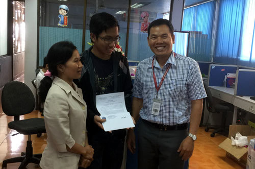 Thạc sĩ Đinh Xuân Tỏa, Trưởng phòng công tác sinh viên thông báo quyết định của Ban giám hiệu nhà trường, hổ trợ 100% học phí của học kỳ đầu tiên cho sinh viên Huỳnh Phước Thiện, khóa 23, ngành Kỹ thuật phần mềm.