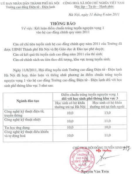 Thông báo tuyển sinh NV1 và hệ cao đẳng chính quy vào trường năm 2011(ngày 11/8), Hội đồng tuyển sinh Trường CĐ Điện tử-Điện lạnh đưa ra mức điểm trúng tuyển của 4 chuyên ngành như sau: