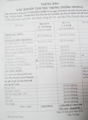Vừa khai giảng xong, chị T (phụ huynh có con học tại Trường Mầm non Hoa Mai, quận 3) đã phải đóng gần 2 triệu đồng. Chị T. cho hay đây là những khoản nhà trường tạm thu có cả bắt buộc và thỏa thuận như 200.000 đồng học phí, 200.000 đồng phục vụ ăn sáng, 300.000 đồng tiền học phẩm và đồ dùng bán trú, 20.000 đồng vệ sinh phí… “So với năm ngoái, năm nay tôi thấy có nhiều khoản tăng cao và thêm một số khoản mà tôi không hiểu tại sao. Ví dụ thu tiền đồ dùng bán trú trong khi vào năm học, tôi đã đóng gần 200.000 đồng tiền gối, nệm, khăn” - chị T. nói.